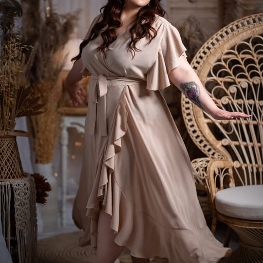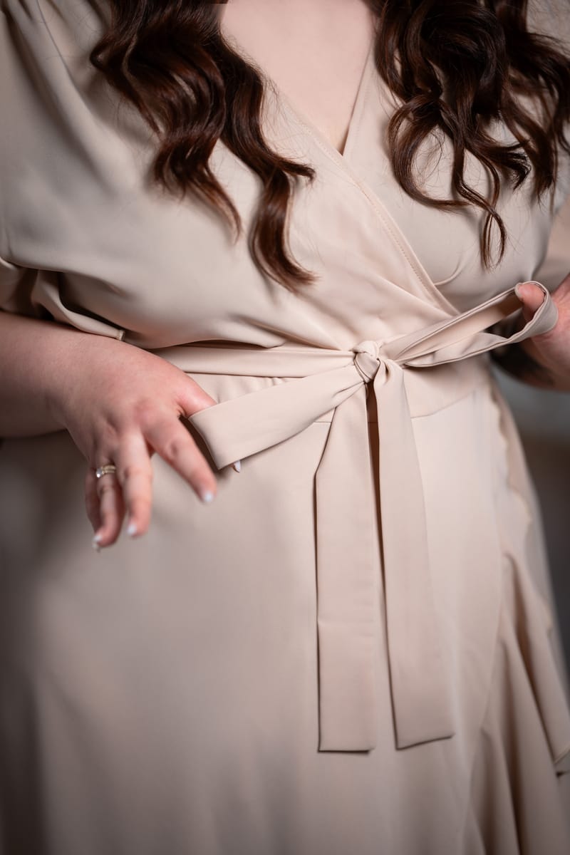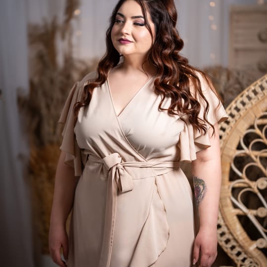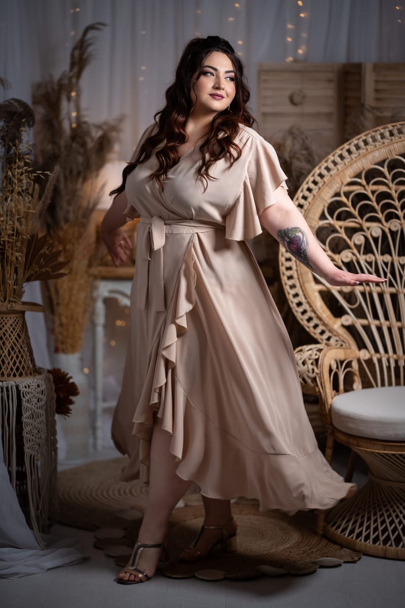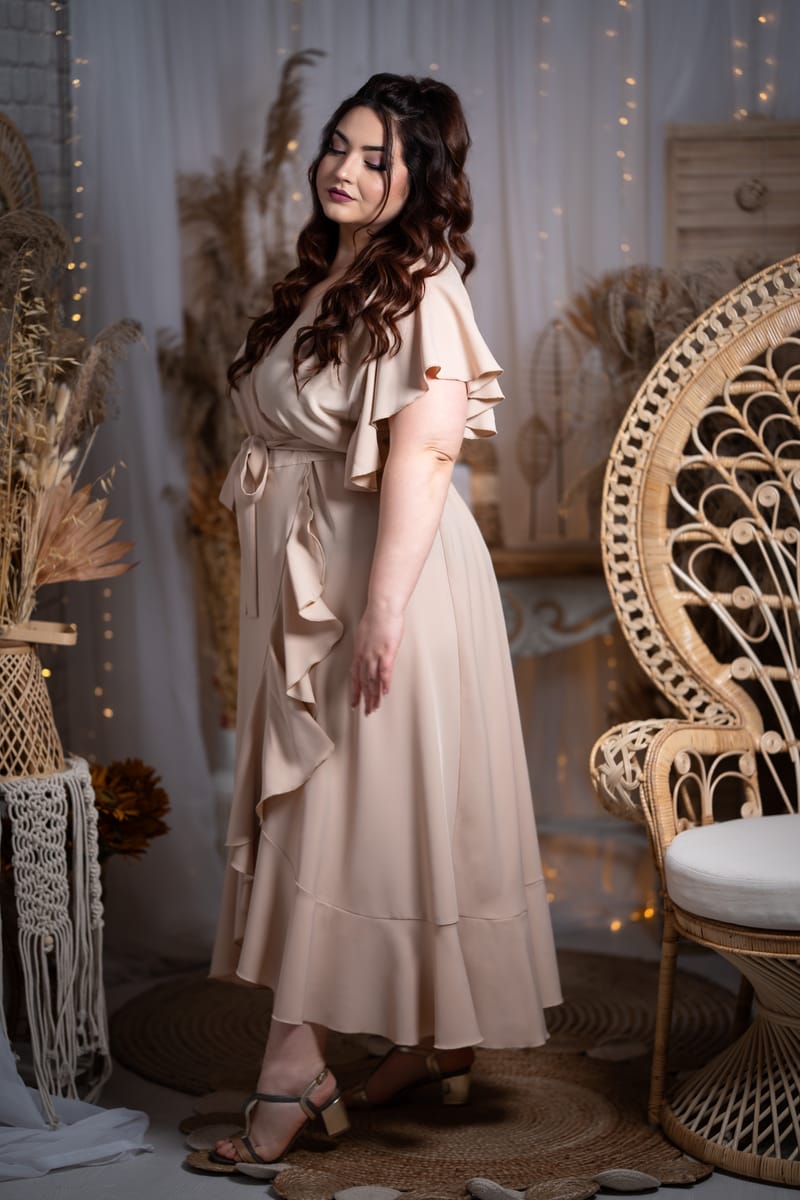 ⚪ Моделът е изработен от лека и ефирна материя в стилен бежов цвят, която създава елегантен и грациозен силует.