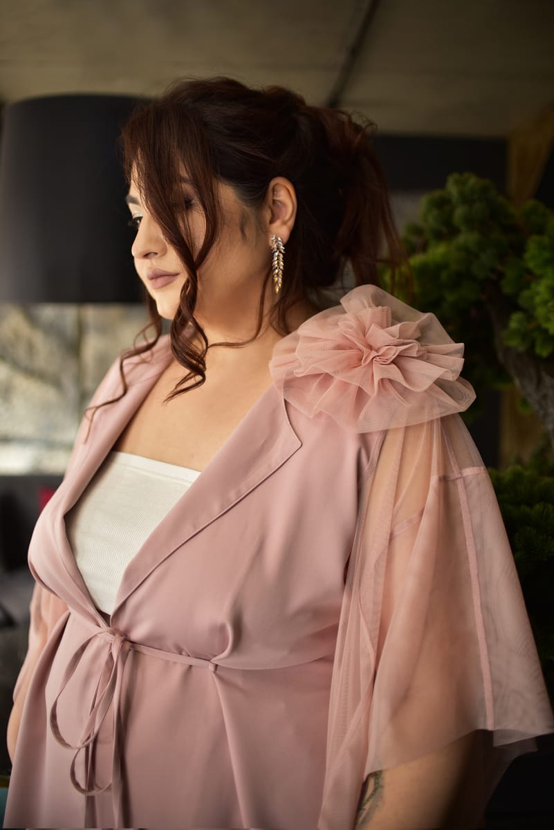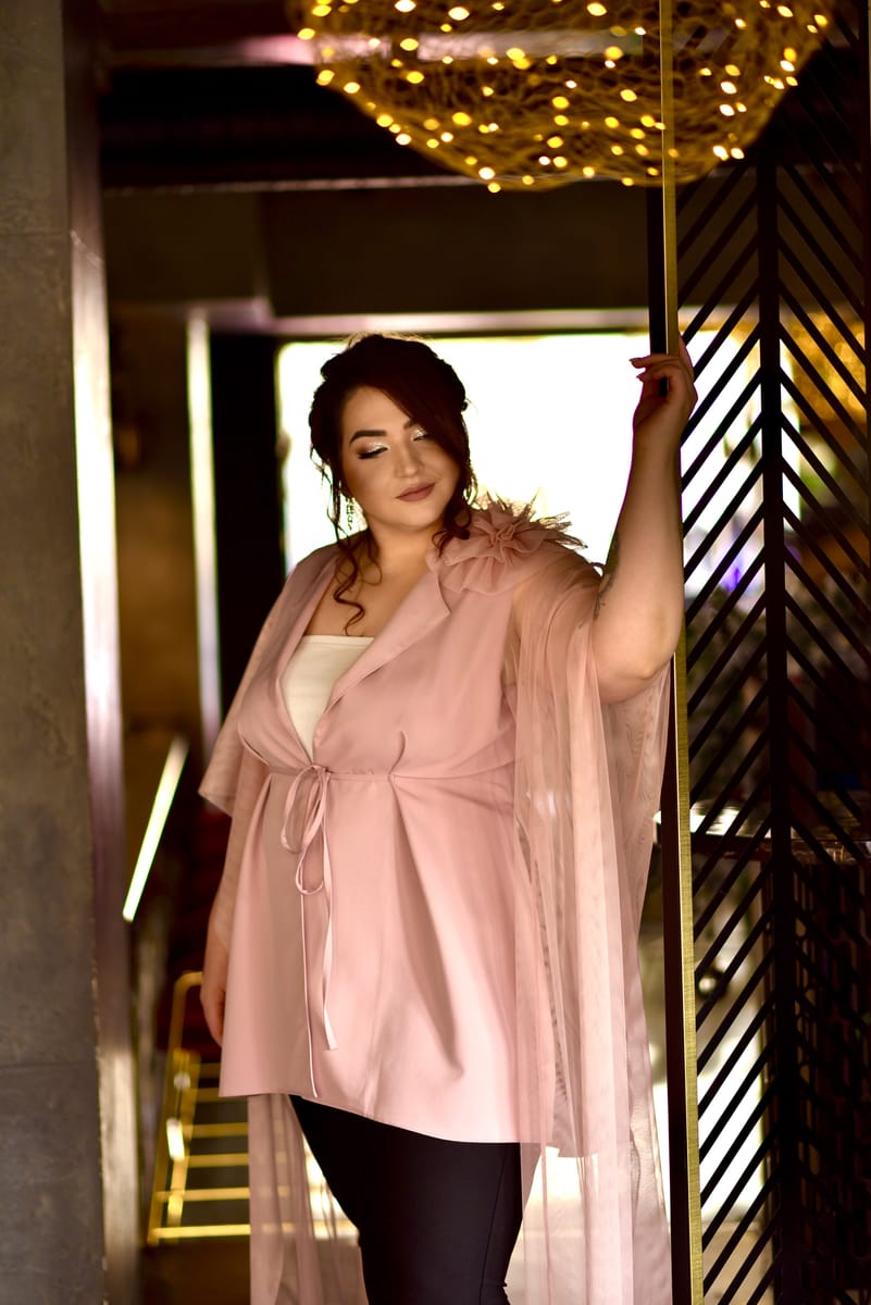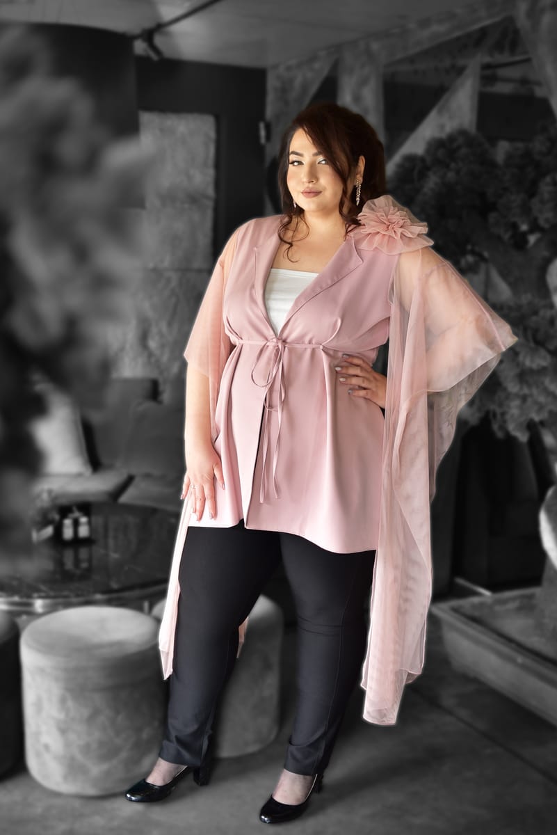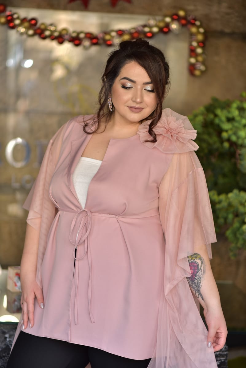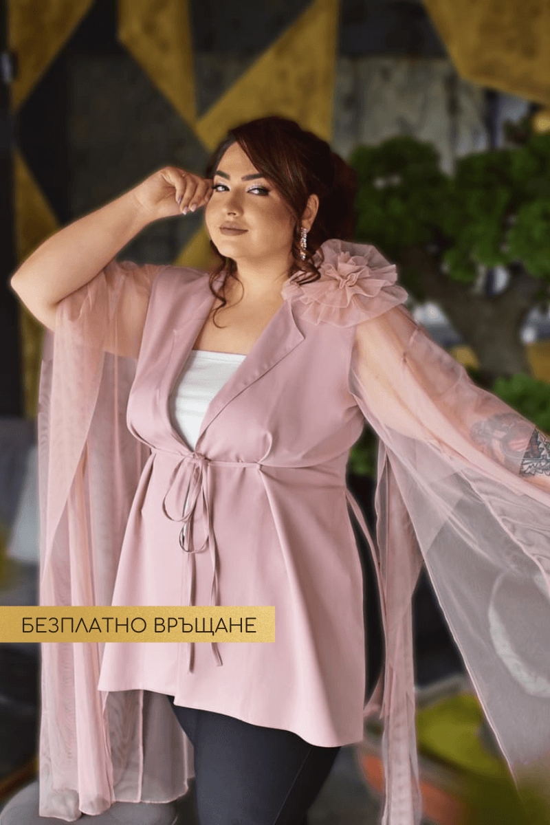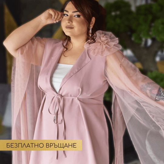 Шармантен модел, създаден от ефирна и лека материя от жоржет. Феерично обгръща тялото и придава усещане за стил и комфорт. Дизайнът на ръкавите е специално създаден, за да издължава силуета, оформя талията и прикрива ръцете.
